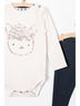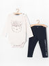 Боди выполнено из хлопкового трикотажа, брюки выполнены из трикотажа рибана.