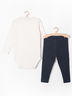 Боди выполнено из хлопкового трикотажа, брюки выполнены из трикотажа рибана.