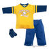 Комбинированная футболка- аппликация на груди, кнопочная застежка на плече и отделка по вороту и на рукавах. Штанишки на удобной эластичной резинке.