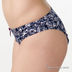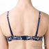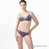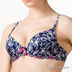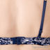 Стильный комплект синего цвета. Бюстгальтер push-up с гелевым наполнителем декорирован цветной аппликацией на на нижней части чашек, между которыми стильный элемент декора в виде серебряного ключика. Трусики-слип с сиреневым бантиком спереди.