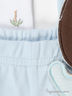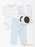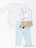 Нежный комплект для мальчика. Состоит из слюнявчика, боди с длинными рукавами и штанишки на поясе-резинке. Модель украшена узором и аппликациями.