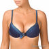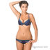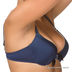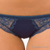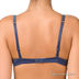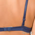 Элегантный комплект синего цвета с украшением впереди. Чашечки с уплотнителем декорированы снизу ажуром, это визуально увеличивает и приподнимает грудь. Трусики слип с ажуром по краям и тонкой резинкой на поясе.