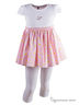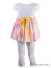 Нежный комплект для летних прогулок. Удлиненный топ украшен атласным поясом-бантом, а пышный подол выполнен из плиссированной ткани с гороховым принтом. Розовые леггинсы отлично сочетаются по цвету с верхом.