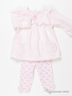Оригинальный комплект состоит из туники и брюк. Туника из велюровой ткани с округлым вырезом горловины и с длинным рукавом. Застежка на кнопки на спине, два декоративных кармашка с бантиками. Брюки из тонкого трикотажа с поясом на резинке.