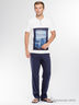 Футболка и длинные брюки из тонкого хлопкового полотна. На футболке спереди нашивка с принтом, вырез горловины круглый на пуговицах. Брюки прямые, по талии на резинке.