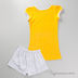 Желтая футболка прилегающего кроя с рукавами-фонариками. На полочке крупная аппликация.