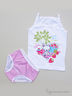 Комплект состоит из двух предметов: майка и трусы. Майка на узких бретелях с округлым вырезом горловины. Спереди модель декорирована контрастным принтом. Трусы на эластичном поясе. Отличный вариант на каждый день.