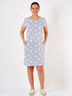 Платье домашнее прямого силуэта со спущенным рукавом из принтованного полотна с тектовым принтом на полочке.