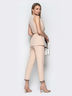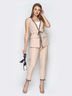 Комфортный комплект-двойка из костюмной ткани. Верх – жилет с кулиской на талии и декоративными клапанами на полочке. Зауженные к низу брюки с просторечными стрелками и удобными карманами в боковых швах. Сзади на поясе предусмотрена эластичная резинка. Застегивается спереди на молнию и кнопку.
