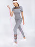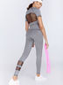 Актуальный эластичный комплект для фитнеса: удлиненная футболка комбинирована стрейч-сеткой в верхней части полочки и спинки с рукавом-реглан и моделирующие лосины с высокой посадкой, эластичным поясом и узкими горизонтальными вставками из стрейч-сетки в нижней части. Изготовлены из качественного хорошо-растяжимого материала и создают оптимальный комфорт.