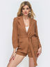 Комплект-двойка из тонкой льняной ткани. Пиджак прямого кроя с декоративными клапанами. Шорты с высокой посадкой с эластичной деталью в поясе. В боковых швах удобные карманы. Комплектуется поясом из основной ткани.