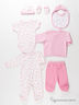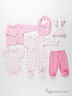Комплект состоит из распашонки, ползунков, комбинезона, боди, слюнявчика, шапочки и царапок.
