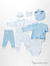 Комплект состоит из распашонки, ползунков, комбинезона, боди, слюнявчика, шапочки и царапок.