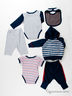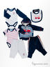 Комплект состоит из толстовки, двух боди, двух брюк и слюнявчика.
