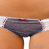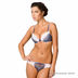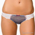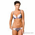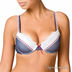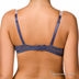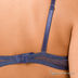 Стильный комплект джинсового цвета. Бюстгальтер пуш -ап (формованная чашка со съемными бретелями) с белой ажурной вставкой и с прошитой сиреневой ленточкой. Между чашечками пришит привлекательный бантик. Бюстгальтер с оригинальными двойными бретелями впереди. Трусики слип с ажурной задней частью и широким поясом.