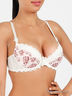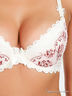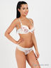 Оригинальный бюстгальтер Push up на косточках с поролоновыми чашками. Выполнен из тонкой шелковистой ткани, внутренняя часть чашек выполнена из мягкого хлопкового материала. Съемные эластичные бретели регулируются по длине. Нижняя часть чашек дополнена съемным уплотнителем. Застегивается на два крючка в три позиции. Декорирован кружевными вставками. Трусы - стринги средней посадки декорированы гипюровым кружевом.