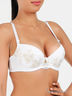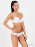 Оригинальный бюстгальтер Push up на косточках с поролоновыми чашками. Выполнен из тонкой шелковистой ткани, внутренняя часть чашек выполнена из мягкого хлопкового материала. Съемные эластичные бретели регулируются по длине. Застегивается на два крючка в три позиции. Декорирован кружевными вставками. Трусы - стринги средней посадки декорированы гипюровым кружевом.