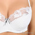 Изящный женский комплект состоящий из трусиков слипов и бюстгальтера классической формы. Бюстгальтер застегивается на металлические крючки, имеет поролоновые чашки. Декорирован кружевными вставками и принтом - полоска, эластичные несъемные бретели регулируются по длине.
