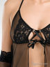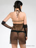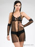 Прозрачная комбинация с завязочками на шее из мягкой мелкой сеточки с кружевом, шнуровкой и украшениями со стразами. В комплект входят трусики и перчатки с широкими кружевными вставками.