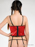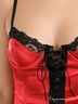 Корсет из эластичного атласа с кружевной отделкой, спереди шнуровка, сзади на крючках, регулируемые бретельки и отстегивающиеся подвязки, в комплекте трусики-стринг.