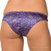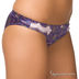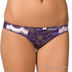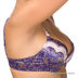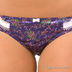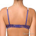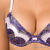Яркий комплект с рисунком в виде мелких цветов на насыщенно-синем фоне. Чашечки "пуш-ап" с гелем декорированы лиловой вставкой с ажуром, а между ними и на бретелях маленькие бантики. Трусики слип так же декорированы бантиком и ажурными вставками.