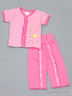 Комплект состоит из 2 предметов: рубашка с застежкой спереди на кнопках с коротким рукавом, бриджи на широкой резинке. Рубашка украшена принтом, бриджи и рубашка украшены декоративной оборкой. Ткань - кулир.