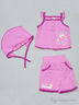 Комплект состоит из 3 предметов: топа, шорт и косынка на завязке. Топ застегивается на пуговицы. Украшен принтом. Шорты на широкой резинке украшены принтом, с 2 карманами. Ткань - кулир.