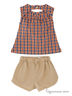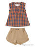 Кофта выполнена из тонкого хлопка, с округлым вырезом горловины и без рукавов, спереди украшена складками. На спинке вырез, присборенный на резинке, верхняя часть сзади застегивается на пуговку. Шортики на резинке, которая может регулировать объем талии. Низ шортиков имеет округлую выкройку. В таком костюме будет очень комфортно в летнюю погоду!