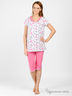 Комфортный комплект для дома из тонкого трикотажа средней эластичности. Футболка с округлым вырезом и короткий рукавом, декорирована оригинальным рисунком, на полочке контрастная оборка и застежка на пуговицы. Бриджи с поясом на резинке, низ изделия с оригинальной окантовкой.