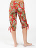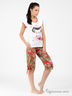 Комплект домашней одежды состоит из двух предметов, майки и штанов. Майка слегка приталенного кроя, без рукавов, полочка изделия украшена принтом. Укороченные штаны свободного кроя с широкой эластичной резинкой в поясе, низ изделия посажен на кулиску. Качественные вещи из натурального, приятного на ощупь материала.