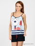 Отличный комплект из тонкого эластичного трикотажа. Окантовка округлого выреза и пройм контрастного цвета переходит в тонкие бретели. На полочке оригинальный принт. Шорты на резинке с двумя карманами, декорированы контрастным бантиком.