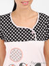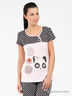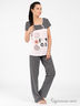 Комплект домашней одежды состоит из двух предметов, футболки и штанов. Футболка прямого кроя, короткие рукава, округлый вырез горловины, полочка изделия украшена принтом. Застежка на кнопки. Штаны прямого кроя с широкой эластичной резинкой в поясе, по бокам расположены открытые карманы. Качественные вещи из натурального, приятного на ощупь материала.