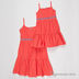 Детали: застежка на молнию на спине, тонкие бретели, талия декорирована бархатистой лентой, низ изделия декорирован воланом. В комплекте два изделия: для мамы и дочери. Платье для мамы 44 размера.