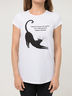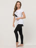 Комплект из удлиненной футболки свободного кроя белого цвета и леггинсов черного цвета. Модель выполнена из мягкого хлопкового полотна. Спинка футболки длиннее переда. На передней детали футболки игривый принт в виде черной кошки и оригинального слогана "чёрной кошке все равно, что о ней думают серые мышки".