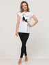Комплект из удлиненной футболки свободного кроя белого цвета и леггинсов черного цвета. Модель выполнена из мягкого хлопкового полотна. Спинка футболки длиннее переда. На передней детали футболки игривый принт в виде черной кошки и оригинального слогана "чёрной кошке все равно, что о ней думают серые мышки".