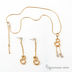 Колье на тонкой цепочке с удлинителем, длинный кулон украшен стразами. Серьги-гвоздики выполнены в том же стиле, что и кулон.