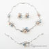 Колье выполнено из металлический элементов оригинальной формы без удлинителя с крупным кулоном, декорированным стразами и жемчужинами. Серьги с замком швензер выполнены в том же стиле, что и кулон. Браслет без удлинителя.