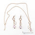 Колье на тонкой серебристой цепочке, кулон на цепочке завершается небольшим камнем. Серьги-гвоздики, выполнены в стиле кулона.