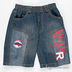 Джинсовые брючки прямого силуэта. В пояс вставлена резинка, пришиты шлевки. Два передних кармана. Изделие украшено принтами и нашивкой. Эффект потертости.