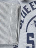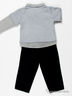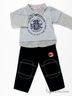 Оригинальный комплект состоит из поло и из брюк. Поло из плотного трикотажа, с отложным воротником и с длинным прямым рукавом, застежка на пуговицы до середины изделия, полочка декорирована набивным рисунком. Брюки из плотного неэластичного денима. Пояс на резинке со шлевками для ремня, два боковых кармана, декоративная нашивка.