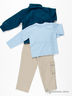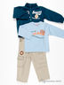 Комплект состоит из лонгслива, толстовки и брюк. Лонгслив из тонкого трикотажа с округлым вырезом горловины и с длинным рукавом. Толстовка из футера с воротом-стойкой. Застежка на молнию, длинный прямой рукав, два накладных кармана. Брюки из плотного денима с поясом на резинке. Пять карманов.