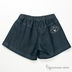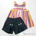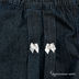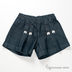 Джинсовая юбка-шорты свободного кроя. В пояс вставлена резинка. Передняя часть изделия в складку, украшена пришитыми банниками со стразами. Сзади декоративная вышивка.