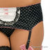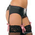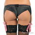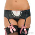 Эротичный, утонченный комплект, состоящий из атласного бюстгальтера со съемными поролоновыми вкладками, атласных трусов-бразилианов с кружевной отделкой и атласными бантами и атласного пояса с кружевной вставкой.