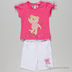 Комплект детский из двух предметов. Футболка с округлым вырезом и короткими рукавами "фонариками", застежка на пуговицы. Шорты с эластичной резинкой в поясе, спереди два втачных кармана, декорированы нашивкой.
