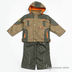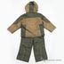 Классический комплект, состоящий из куртки и брюк. Куртка с застежкой на молнию и на планку с кнопками, капюшон на кулиске, длинный прямой рукав, четыре кармана. Брюки на резинке, с двумя карманами.