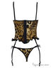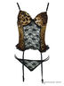 Комплект, состоящий из корсета с формованными чашками, застежкой сзади на крючки, драпировкой на чашках и трусиков стринг на тесемках. Комплект выполнен из принтованной ткани и кружева с рисунком. Пажи для чулок регулируются и отстегиваются.