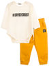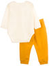 Боди с длинным рукавом, застежка на кнопки. Брюки под памперс, на манжетах. Спереди два кармана с отрезным бочком. Изготовлены из петельчатого футера с эластаном.