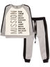Лонгслив с длинным рукавом на манжете. По рукаву лампас, В горловине манжет. Спереди стильный принт. Изготовлен из кулирки с лайкрой. Брюки двухцветные, со спущенным шагом, низ штанин на манжетах. Боковые швы заведены вперёд, в них два кармана. В поясе эластичная тесьма и шнур. Изготовлены из петельчатого футера с полиэстером.