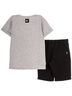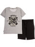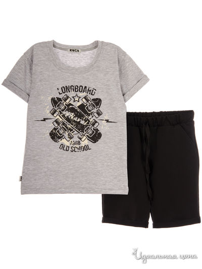 Футболка с коротким рукавом, рукава с отворотом. По переду стильный принт. Шорты средней длины с карманами. Футболка изготовлена из кулирки с лайкрой, шорты из футера с полиэстером без начеса.