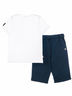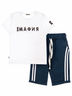 Футболка с коротким рукавом, в горловине манжет. Спереди модный принт. Изготовлена из кулирки с лайкрой. Шорты удлиненные, спереди карманы с отрезным бочком. Сзади один накладной карман. По боковому шву лампасы. Низ шорт подвернут. В поясе продернут шнур. Изготовлены из петельчатого футера с эластаном.